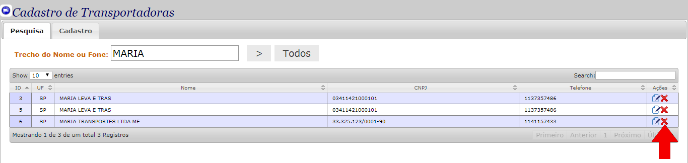 - Para excluir a transportadora só ir na coluna Ações e clicar no X em vermelho e clicar Ok.
