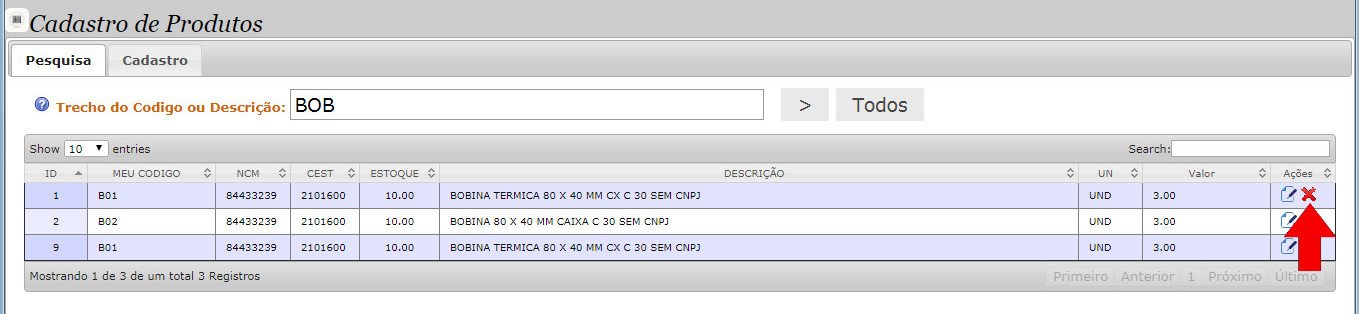 - Para excluir o produto só ir na coluna Ações e clicar no X em vermelho e clicar Ok